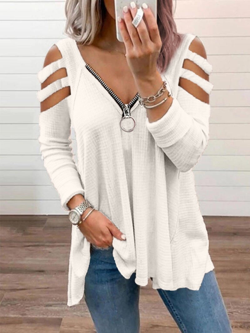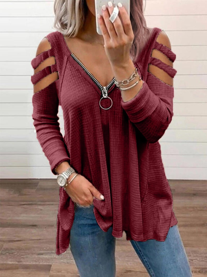 جريئة ومثيرة ، من المؤكد أن هذا السحاب الأكمام الطويلة للأكمام الطويلة للنساء ستجعلك تلاحظك. يتميز هذا القميص بتصميم فضفاض لتصميم سحاب كبير.