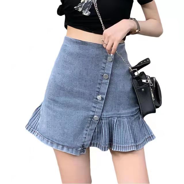 The Women’s Ruffled Denim Asymmetrical Mini Skirt is a one of a kind piece of apparel perfect for lovers of 90s styles. It features decorative buttons that give it a wrapped look.
