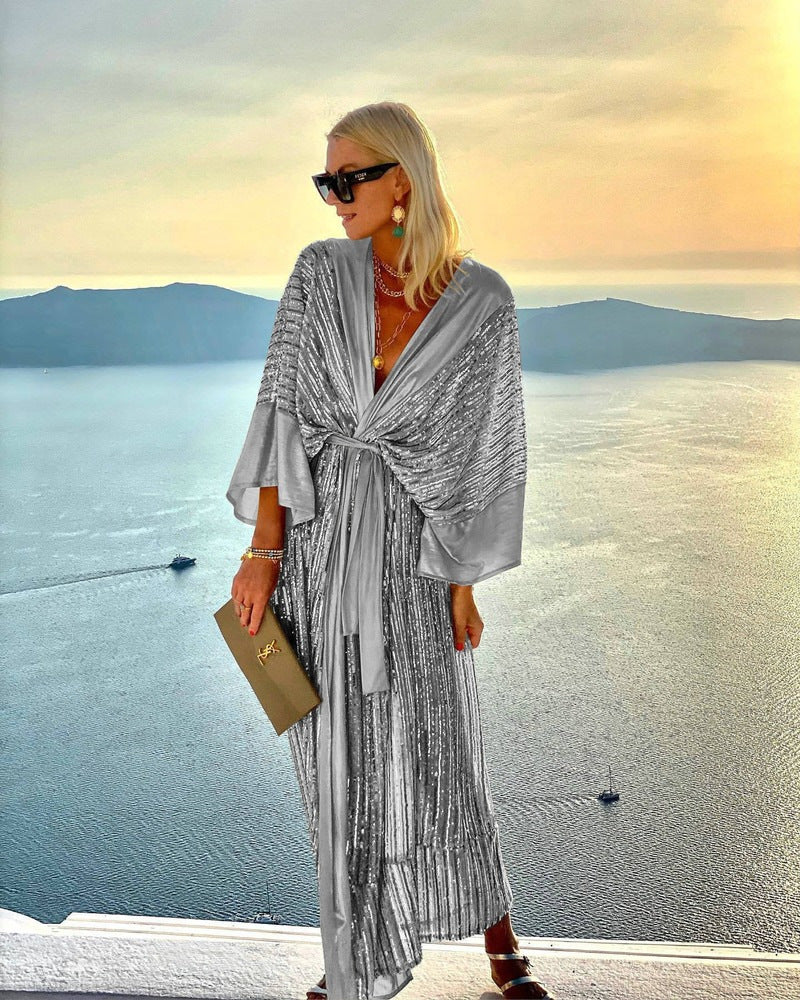Donnez une touche élégante à vos nuits en portant la robe maxi chatoyante à col en V lâche des femmes disponible dans votre choix d'options de couleurs métalliques ou rouges pour s'adapter à tout sens du style.