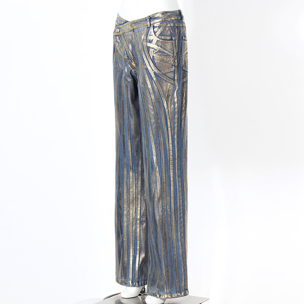 चांदी के ब्रश के साथ गिल्डेड स्लांट-बकल जींस डिटेलिंग