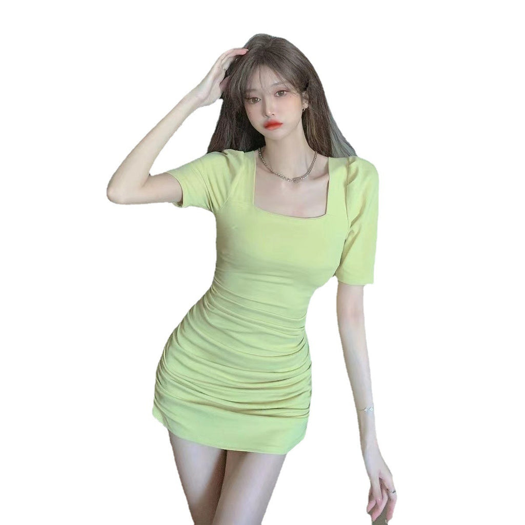 स्क्वायर कॉलर और प्लीटेड कमर के साथ पफ-स्लीव कोर्सेट ड्रेस