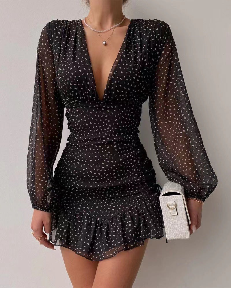 वी-गर्दन के साथ महिलाओं के रूप में बेल आस्तीन मिनी पोशाक फिटिंग