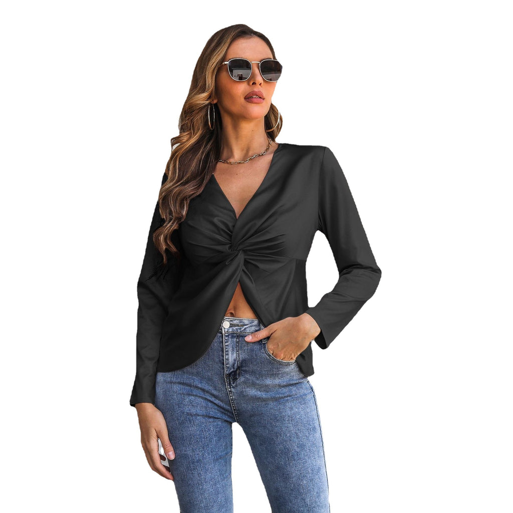 Aggiungi un tocco civettuolo al tuo abbigliamento quotidiano quando indossi la blusa del collo a V di forma da donna con buco di peekaboo che mostra un accenno al tuo medio della tua media. Scegli tra un elegante colore bianco o nero.