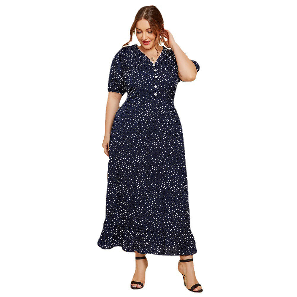 Flattering yet loose fitting, this comfortable Women's Maxi Dress with Short Sleeves and Buttons is the perfect choice for spring days. It features a navy blue and white polka dot pattern.
