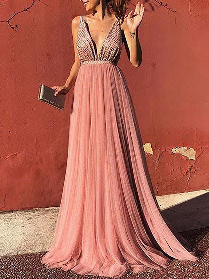 Elegante e sofisticado, o vestido rosa do estilo Princess feminino com decote em V e Maxi Hem é versátil o suficiente para qualquer ocasião formal. Possui um decote em V íngreme com ombros de tiras e uma saia maxi fluida.