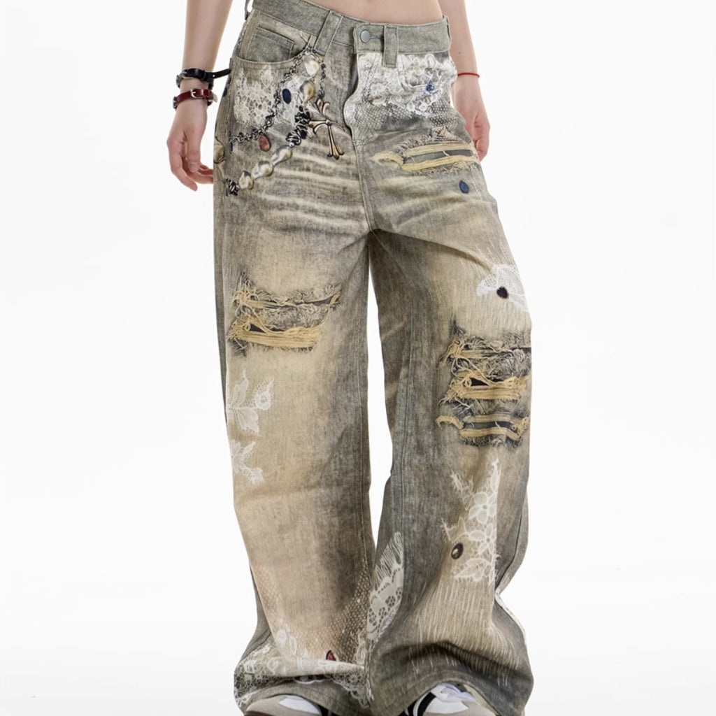 聲明跨印刷寬牛仔褲帶有圖形吸引力